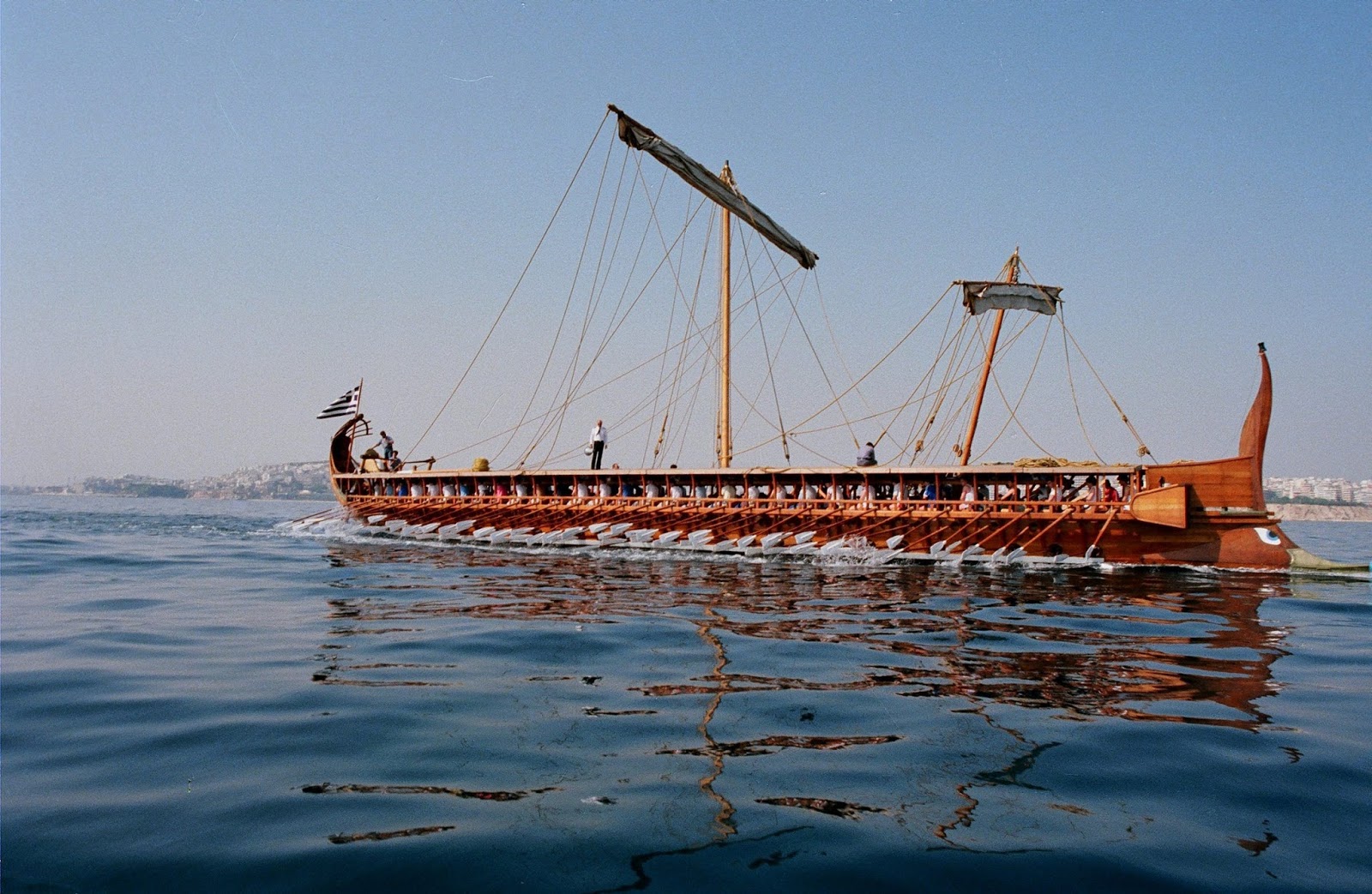 The image of Olympias, a modern reconstruction of an Athenian trieres ('trireme') comes from the present day Hellenic Navy. How cool is that? Click to see in full embiggened glory. (And minor note that I flipped the source image.)